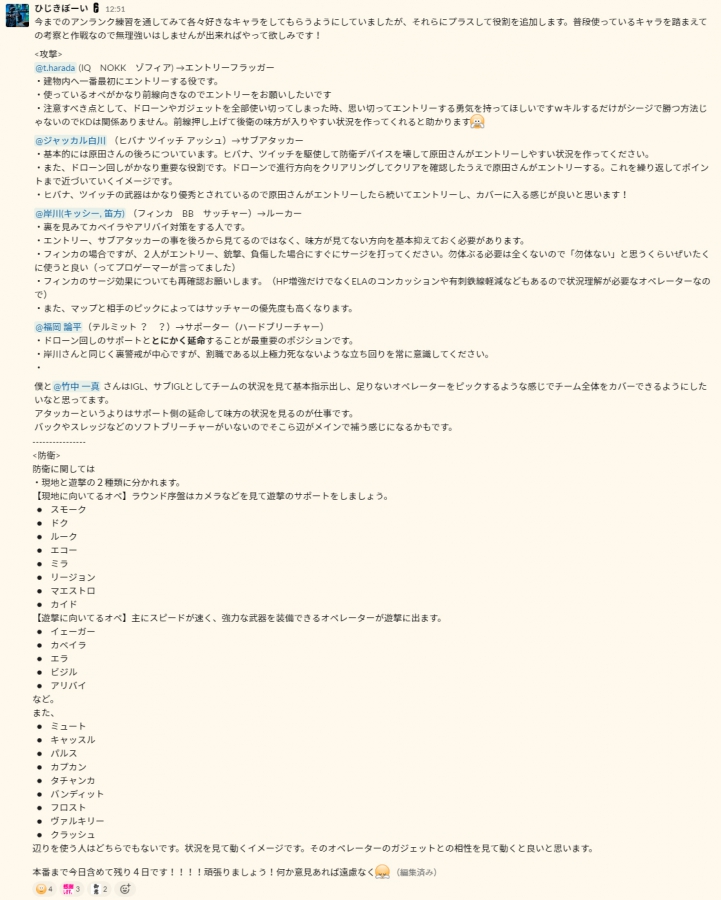 気をつけた点としては「○○の時の状態は△△するといい」「○○のオペレーターは△△のオペレーターと相性がいい」「防衛の○○のオペレーターを警戒して△△のオペレーターを出そう」などその場の状況に合わせて解説することを心がけていました。